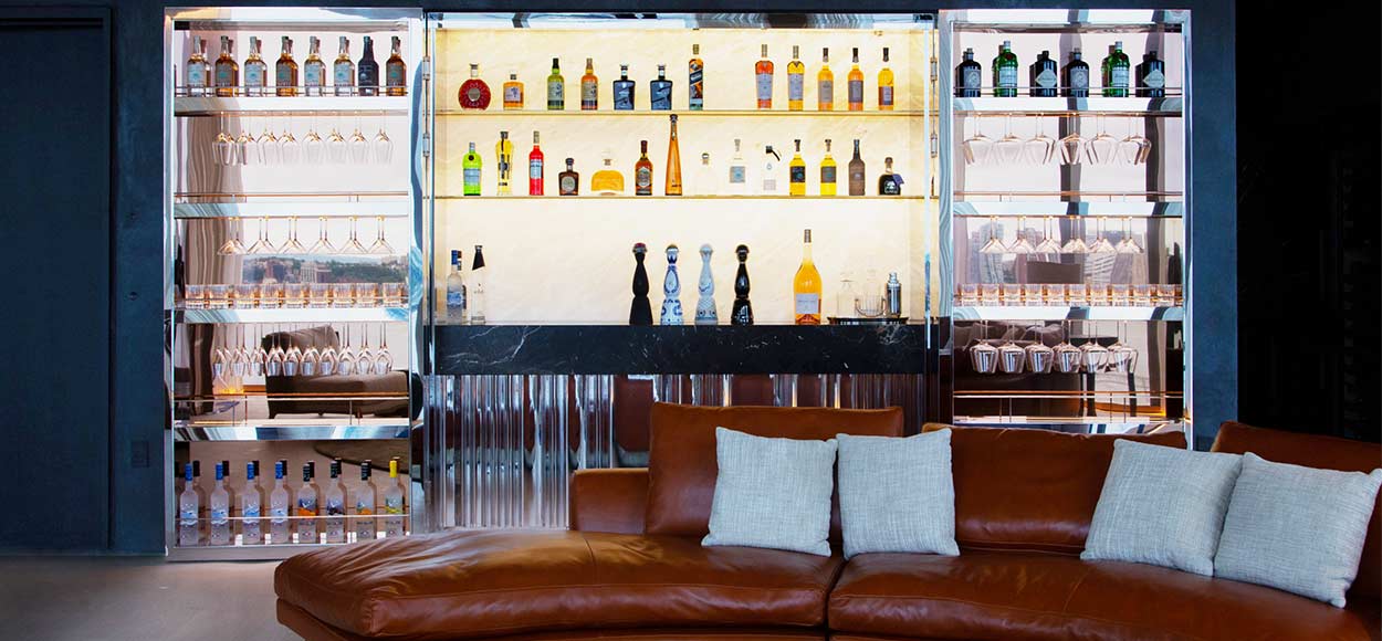 Libreria in acciaio lucido con saldature eseguite in opera, mobile bar in acciaio lucido, ottone, onice, mobili cucina, mensole in acciaio lucido, vasca da bagno personalizzata in acciaio e rame.