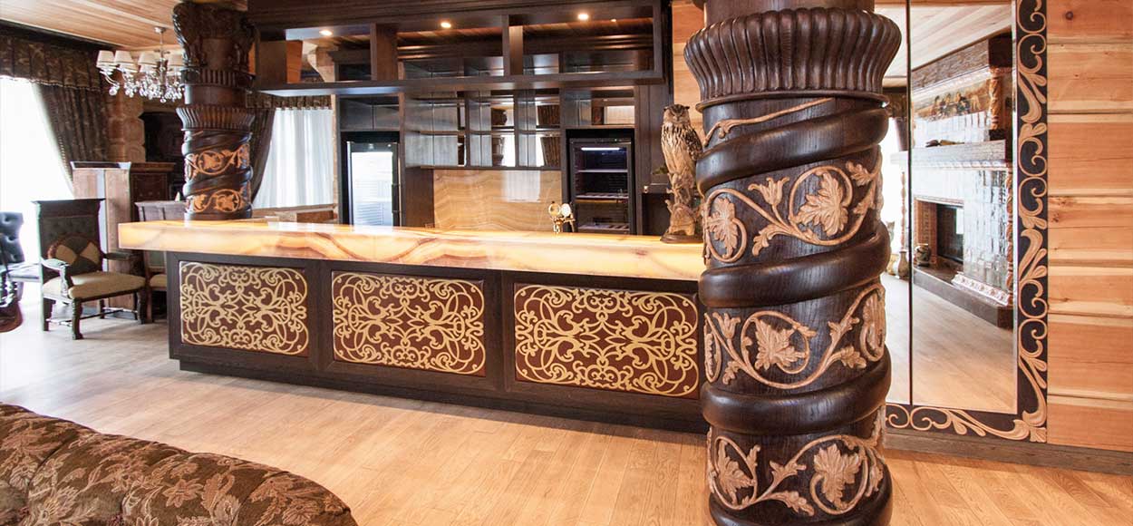 Fornitura pavimentazione in parquet, piastrelle in ceramica, tappeti, illuminazione. Produzione di porte, 2 cucine, mobili sala relax, bar principale, colonne in quercia intagliate, mobile tv, balaustra scale, arredamento completo di tutte le camere. Sauna e sala massaggi. Arredamento completo della zona piscina con bar, cantina vini e sala cinema. Lavandini bagni. Fontana giardino in marmo.